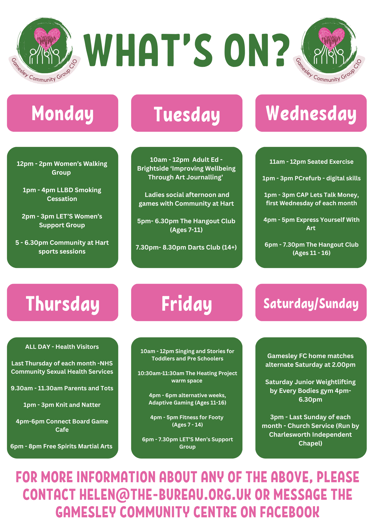 For more information about anything going on at the centre, please click below to our 'What's On' page or email us!