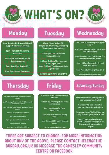 For more information about anything going on at the centre, please click below to our 'What's On' page or email us!