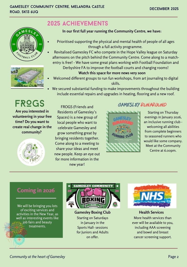 © 2025 - Gamesley Community Group CIO is a registered charity in England & Wales, number 1208809. Current contact details as above.
